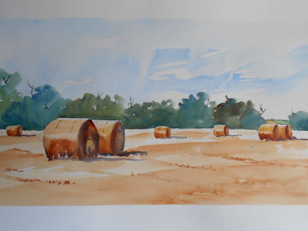 Seeing bales in a field at this time of year is one of my favourite things and I always look forward to painting them. This year I had to be quick as the local farmers wasted no time in taking them under cover, and who can blame them?