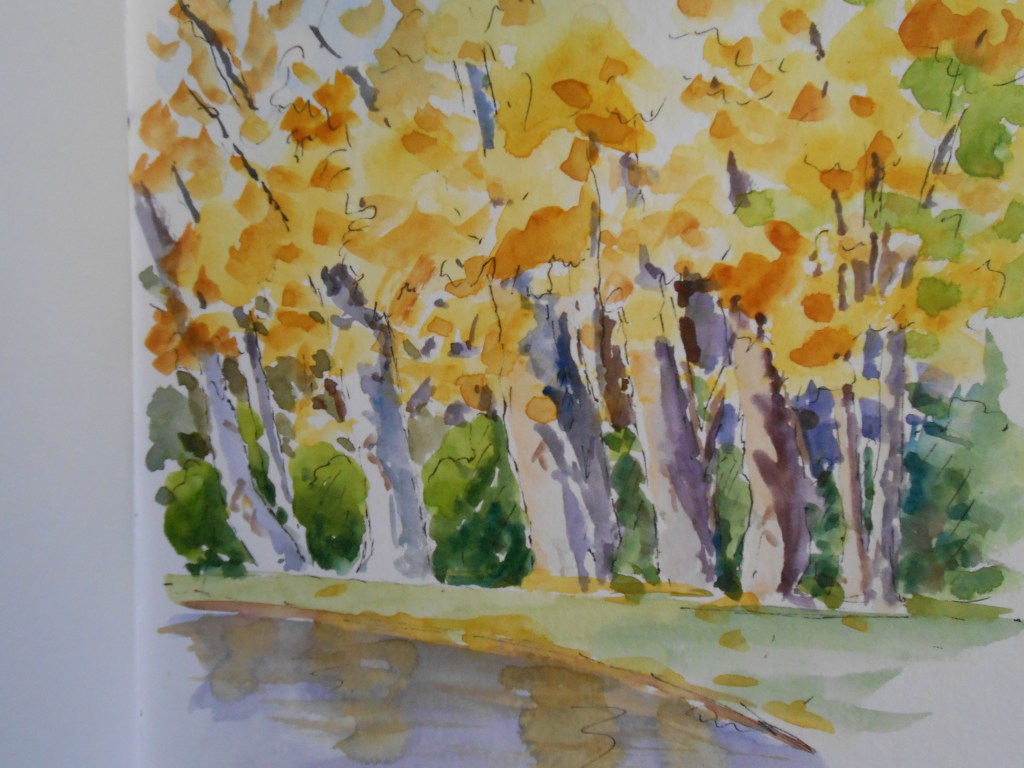 I am starting a new sketchbook to celebrate the beginning of November and, as it turns out, the start of another national lockdown for at least the next four weeks. The sketchbook is a 7.5 inch square format, which I haven’t tried before but which I think I might like. The trees are halfway along the lane between house and village, and the yellows I used were a mix of a Lemon yellow with New Gamboge and darkened with some Burnt Sienna added and Winsor Violet where I wanted even darker.