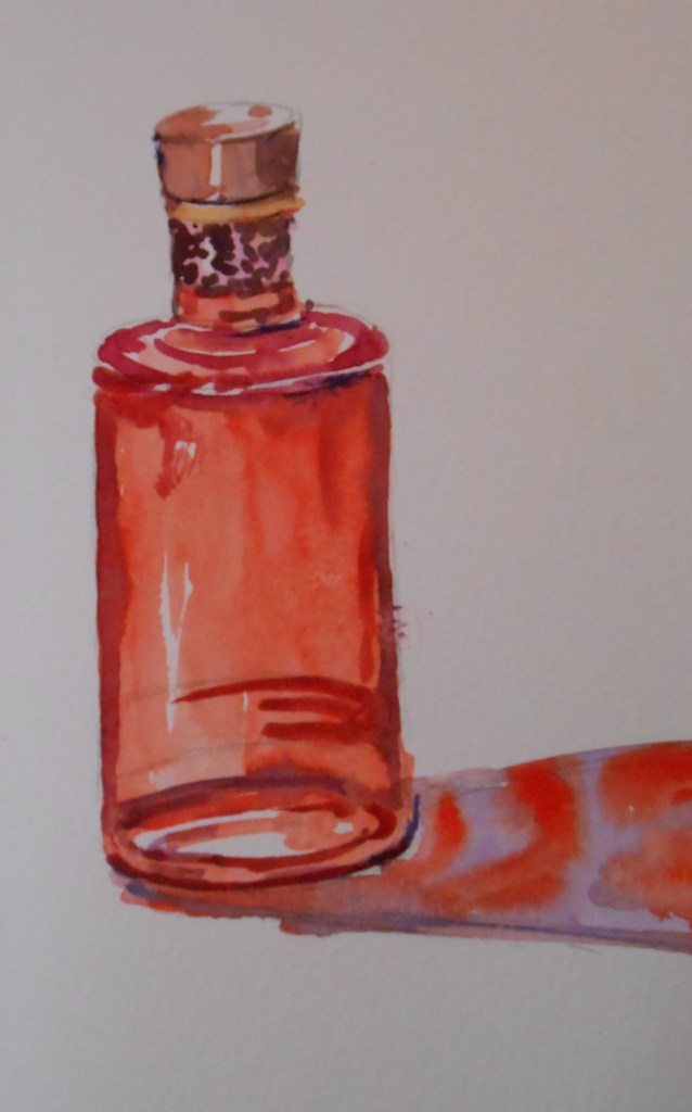 Unfortunately, the Gin was missing – only the bottle reached me, but in fairness it was the light coming through the bottle which made me want to paint it. I wasn’t sure which red would work best, so I painted brushstrokes of a few different reds onto an offcut of paper, and then held it behind the bottle while I looked through the coloured glass. One of the brushstrokes seemed to disappear, which meant that was the one closest to the colour of the bottle. And the winner was… Cadmium Scarlet. I added Crimson and a little Violet for the shadows and left some slithers of untouched paper for some of the lights