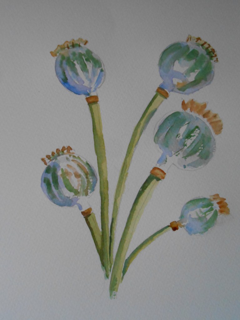 During a routine garden tidy-up this weekend, one of the casualties was a sad looking bedraggled poppy with shrivelled leaves flopping over the wall and across the pavement. I saved these seed pods to paint and to keep until they are ready to burst and provide us with a lot of offspring next year.