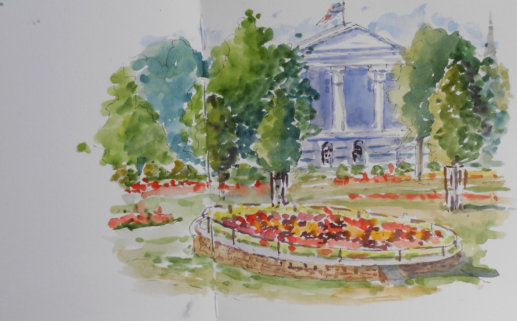 Sketched this view in Imperial Gardens, Cheltenham, this morning before it became too hot, although I did find a handy tree to sit beneath.Plenty of people walked by, but only one stopped to ask what I was sketching, and declared it “Smashing!”