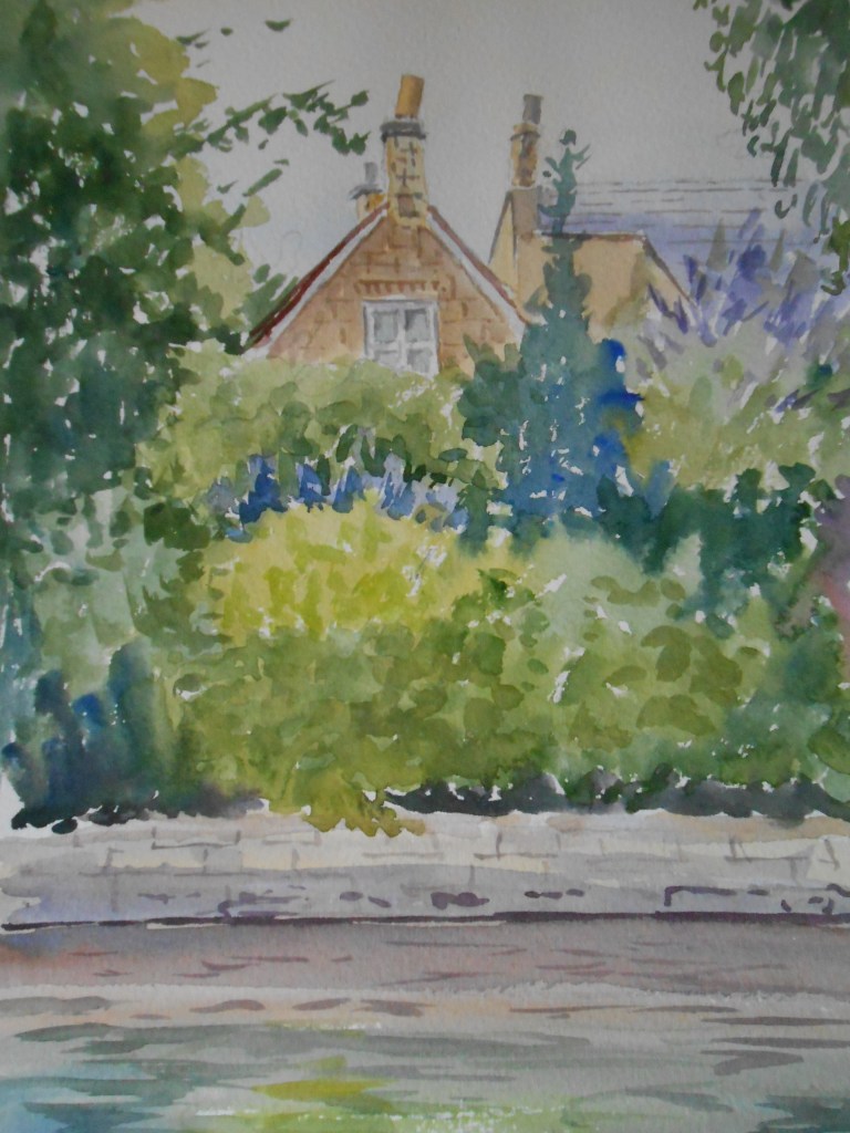 Along the riverbank, the rear views of buildings mostly shielded by shrubs and trees, can be just as interesting as the more often seen frontage with their large windows of items for sale if commercial, or the doors and windows surrounded by climbers such as roses, clematis or wisteria of private properties. This is especially true of older structures which have been lived in for many generations, and are now showing signs of old age and beginning to sag in places. The chimneys here are hardly exaggerated at all.