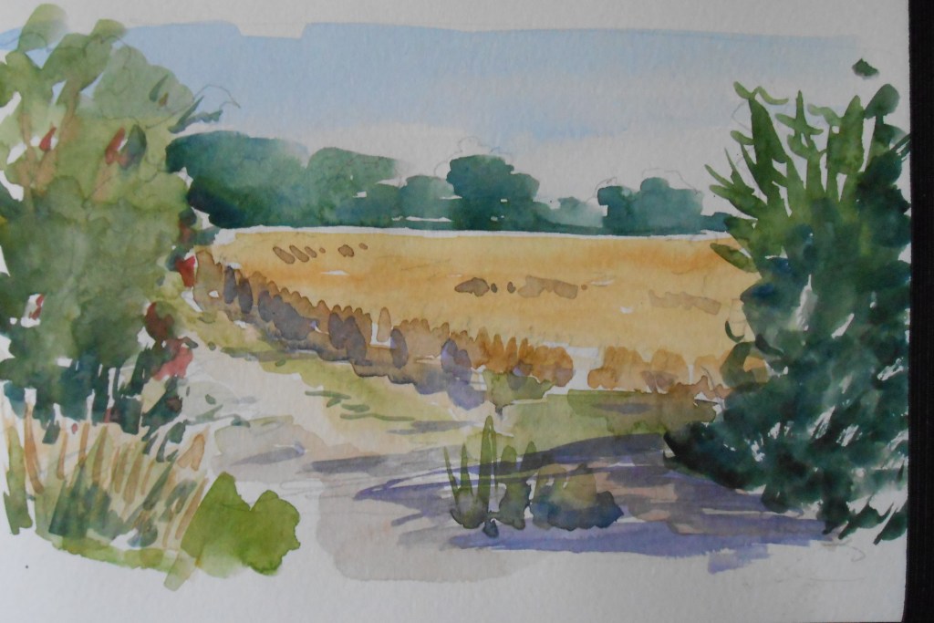 I sketched this early this morning before the heat became hotter. I’d heard there were bales in a field nearby, but they had already been collected and taken away. This is the view passing from one field into another, the edge being a footpath leading to yet another field and so on. Some days one can walk for miles without meeting anyone, other times it seems the whole world is out walking their dogs. Or running. This morning it was pretty much deserted except for the flies.