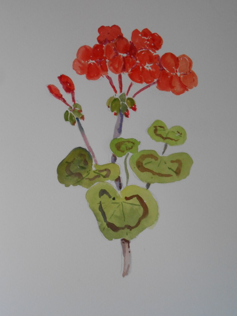 I’ve been meaning to paint a Geranium (or Pelargonium) for some time to add to my series of floral greeting cards. I used mostly Cadmium Scarlet with some yellow and also Alizarin Crimson for the flowers. The leaves are mostly Lemon, permanent sap green and French ultramarine with Burnt sienna.