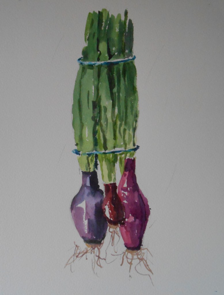 After a night of thunder and lightening, I was hoping it would be a better day, but the rain came down in torrents for a while, which it was bound to at some point. I was glad to find these red spring onions in the shop to bring home and paint, although why they are here as we head into Autumn, I am not sure.