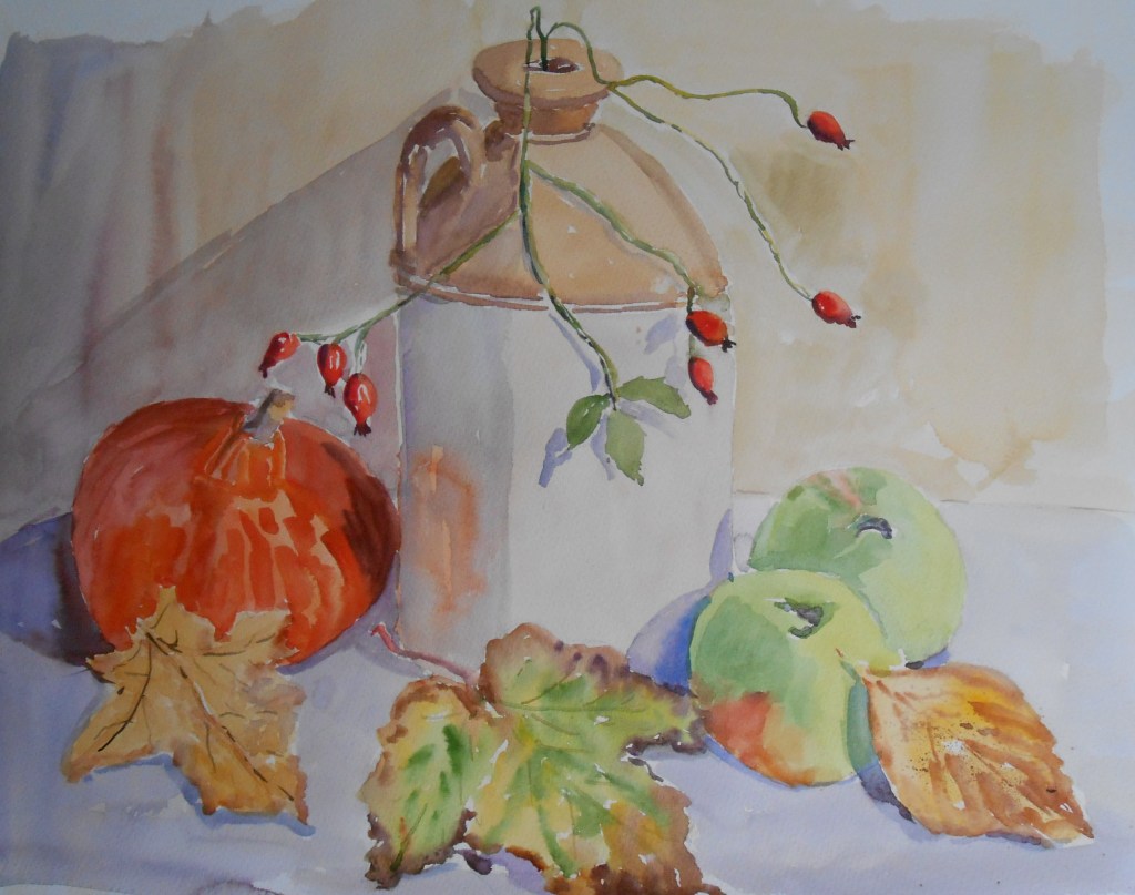 Now we are hurtling through Autumn and the colours are changing by the day, and around here, the fallen leaves are quickly turning to mush. However I found one or two to pair with a pumpkin which survived Hallowe’en and put them with this piece of Stoneware. Yellow Ochre, New Gamboge, Burnt Sienna and a little Sap Green went into the leaves, with a bit of Winsor Violet in the darks.