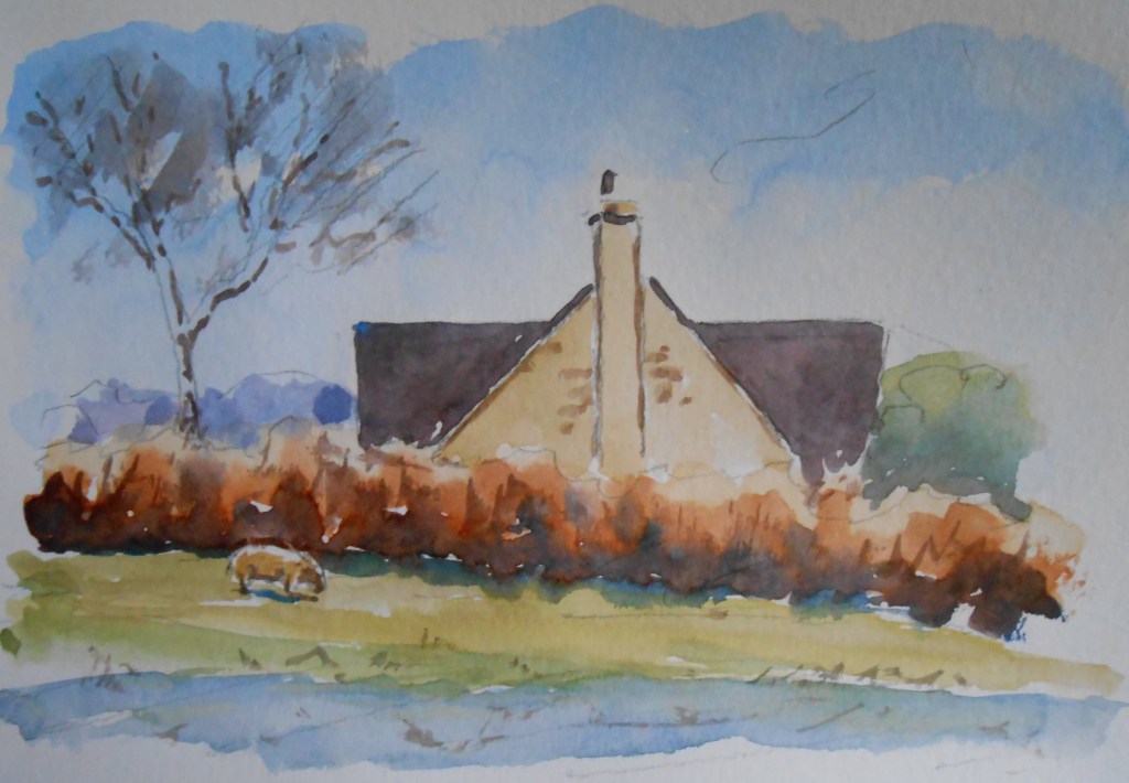 This house was catching the sunlight when I went for a walk this morning. Despite a -4 degree temperature a couple of hours earlier, when the sun broke through it was really quite pleasant, and I managed to do a quick sketch undisturbed. Not so many dog walkers around as usual! Later on, I spotted a tent on the banks of a lake, and various rods sticking out of it and nets and boxes strewn around, led me to suppose there maybe someone inside hoping to catch a fish. I didn’t bother hanging around to see if he was successful. I might have been there all day.