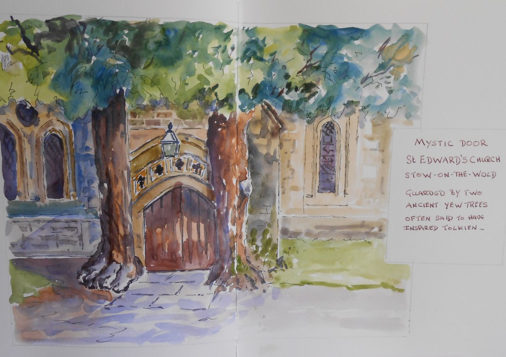 The north door of St Edward’s Church in Stow on the Wold, stands diminutive between two sturdy tree trunks, as strong as a Giant’s legs, straddling the entrance, protecting it from harm. No wonder many people believe this place inspired Tolkien in his portrayal of a secret world.