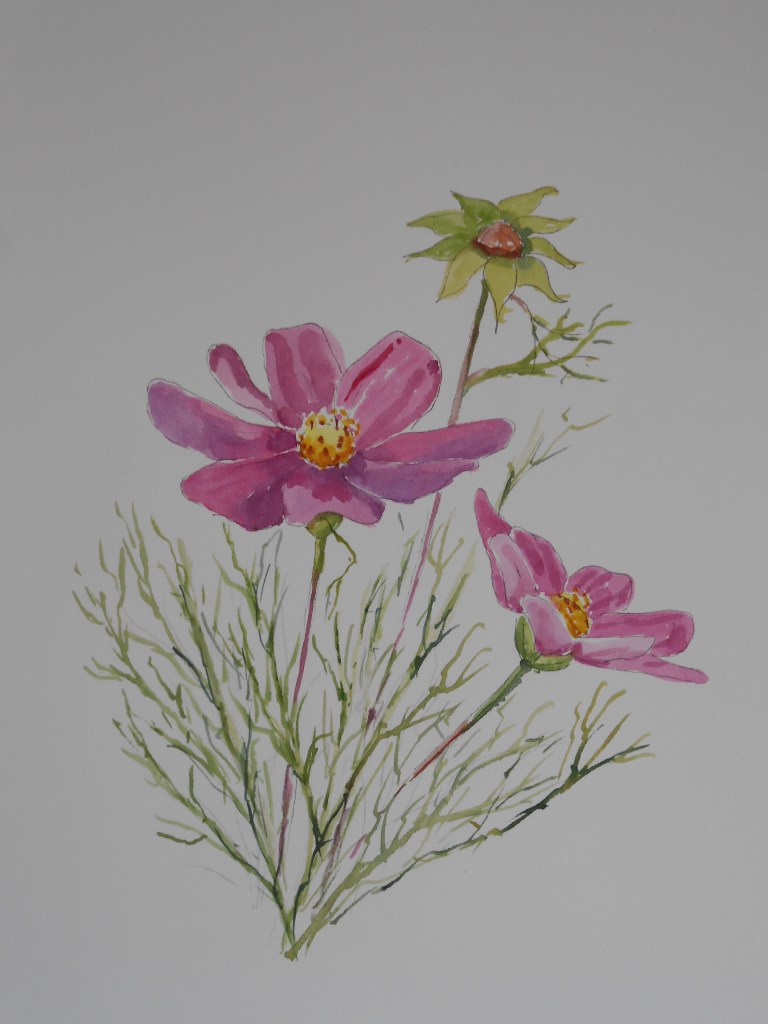Despite the wind and the rain, many of the flowers in the garden are thriving as though the weather holds no fear for them at all. Many seem actually to be enjoying our Summer. One of our annual staples both in pots and in the ground is the beautiful Cosmos which look so wispy that it’s a wonder they survive at all. For the flowers I used mixes of Permanent Rose, Quinacridone Magenta, and Cobalt blue. The central button is Lemon yellow, New Gamboge and a spot of Rose. New Gamboge, Permanent Sap green and a little French Ultramarine in various mixes, made up the greens.