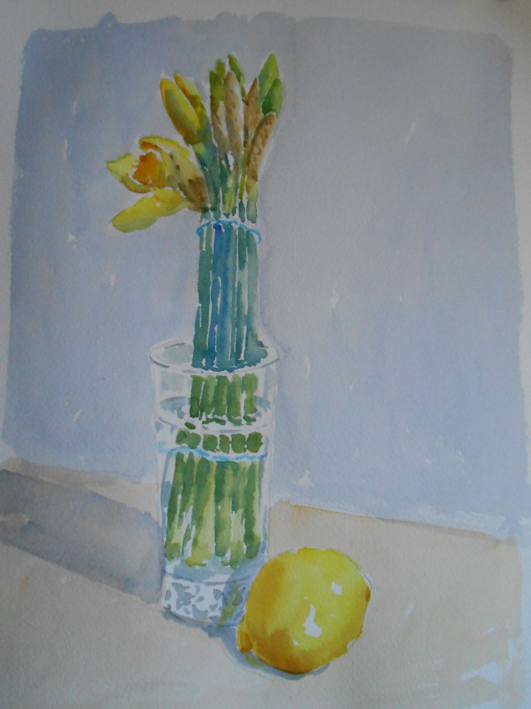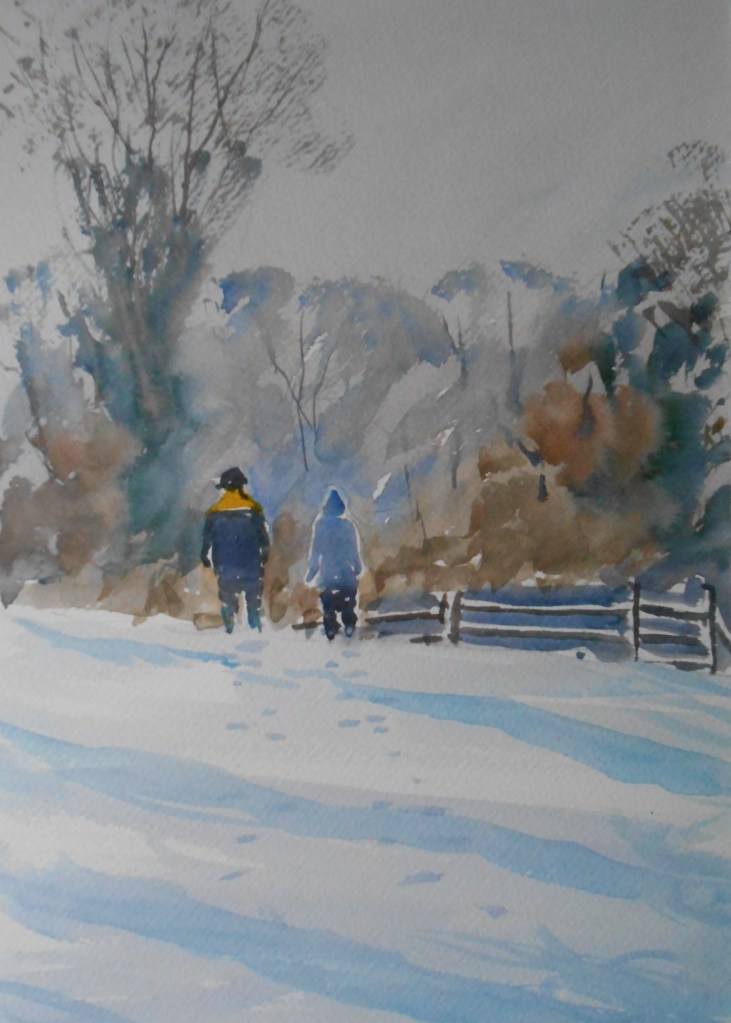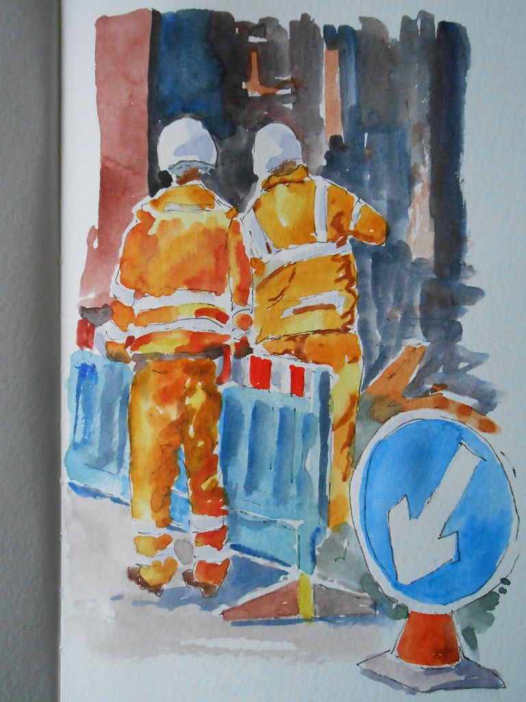 They have been lining the drains around here for most of the week, and whilst I am not too sure what the process involves, it has clearly taken a great many vehicles of all shapes and sizes, pumps, generators and swarms of orange-clad men in white helmets who, between sporadic bursts of manic activity, did a lot of standing around, talking. Which was most fortunate for me, once I realized they weren’t going to be changing position very often, as it gave me the chance to try and draw them. They mostly stayed still except the one on the left in this sketch who kept wriggling his legs I think in an effort to keep warm, but for all I know he could have been rehearsing his part in an upcoming pantomime. Anyway, they seem to have lost interest in our road now.