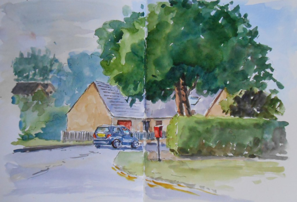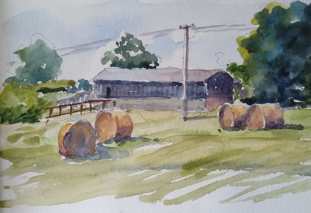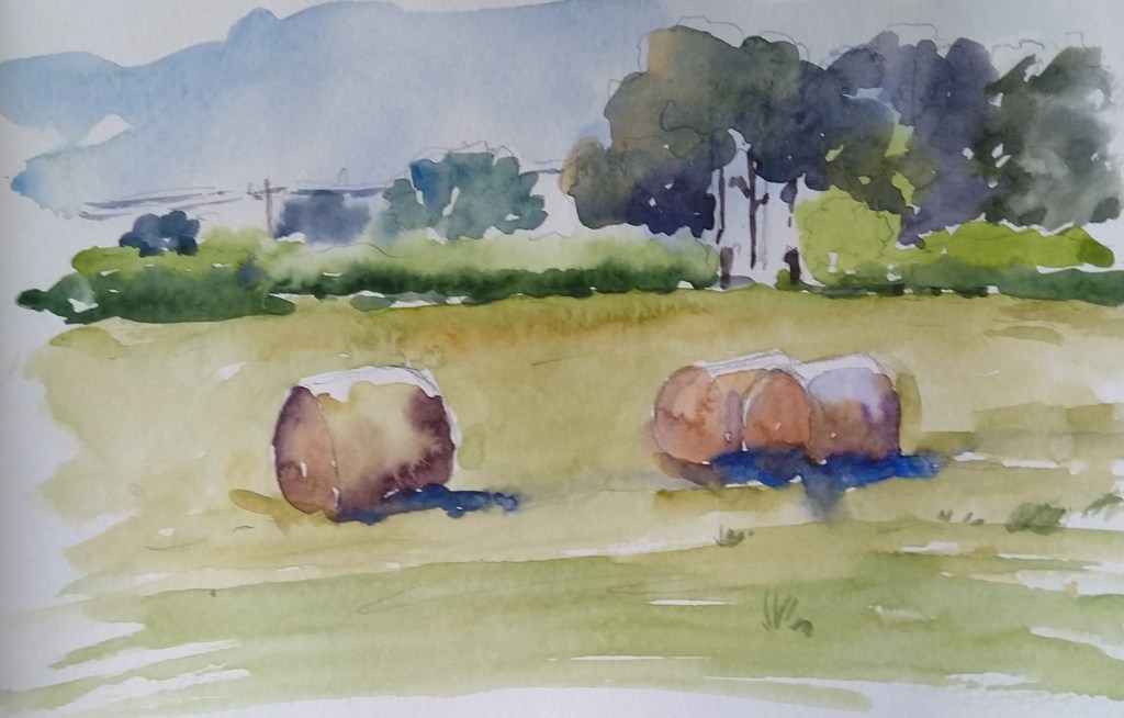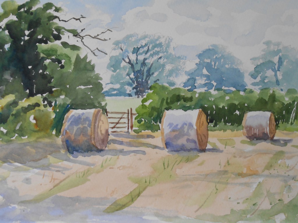 Everyone needs a special place, and for each person it will be different. For me it is this spot which fulfills me. But even as I finish this painting, I hear the tractor and trailer, which will scoop up the bales and remove them, approaching. The gentle breeze of the past few days is working itself up into something stronger, presaging a change in the weather. Next week will be different, but I know my special place will be there again one day, and I will be drawn to it, to be nourished again, as I always am.